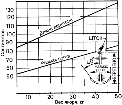 | Преимущество адмиралтейского якоря состоит в том, что он обеспечивает хорошее сцепление на различных типах грунта. Это одна из немногих моделей якорей, рога которых могут проникать сквозь слой придонных водорослей и надежно закреплять конструкцию на грунте. На практике постановка судна на якорь в водоемах, заросших бурыми водорослями, всегда связана с определенны риском. На приведенном ниже графике показаны пропорции адмиралтейского якоря, обеспечивающие максимальное сцепление. Важно чтобы лапы якоря были острыми, а веретено надежно соединялось с рогами для обеспечения необходимой прочности. | ![]() |