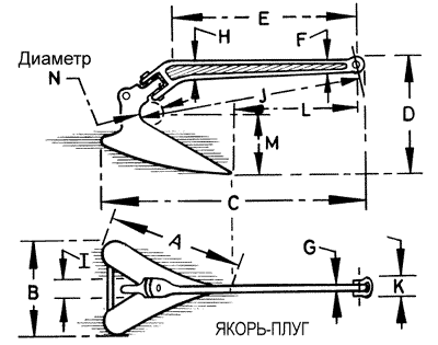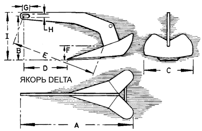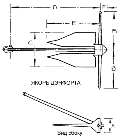| На схемах показаны типовые размеры якоря Дэнфорта, широко применяемого на практике. Не следует допускать значительного отклонения от рекомендованных пропорций. Размеры и вес якоря Дэнфорта